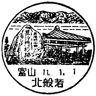天然記念物・毘沙門杉の跡碑、毘沙門堂、立山連峰