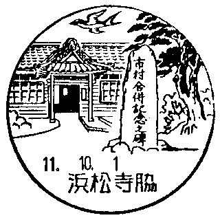 白脇村浜松市合併記念碑、市木・マツ、市鳥・ツバメ、白脇小学校玄関
